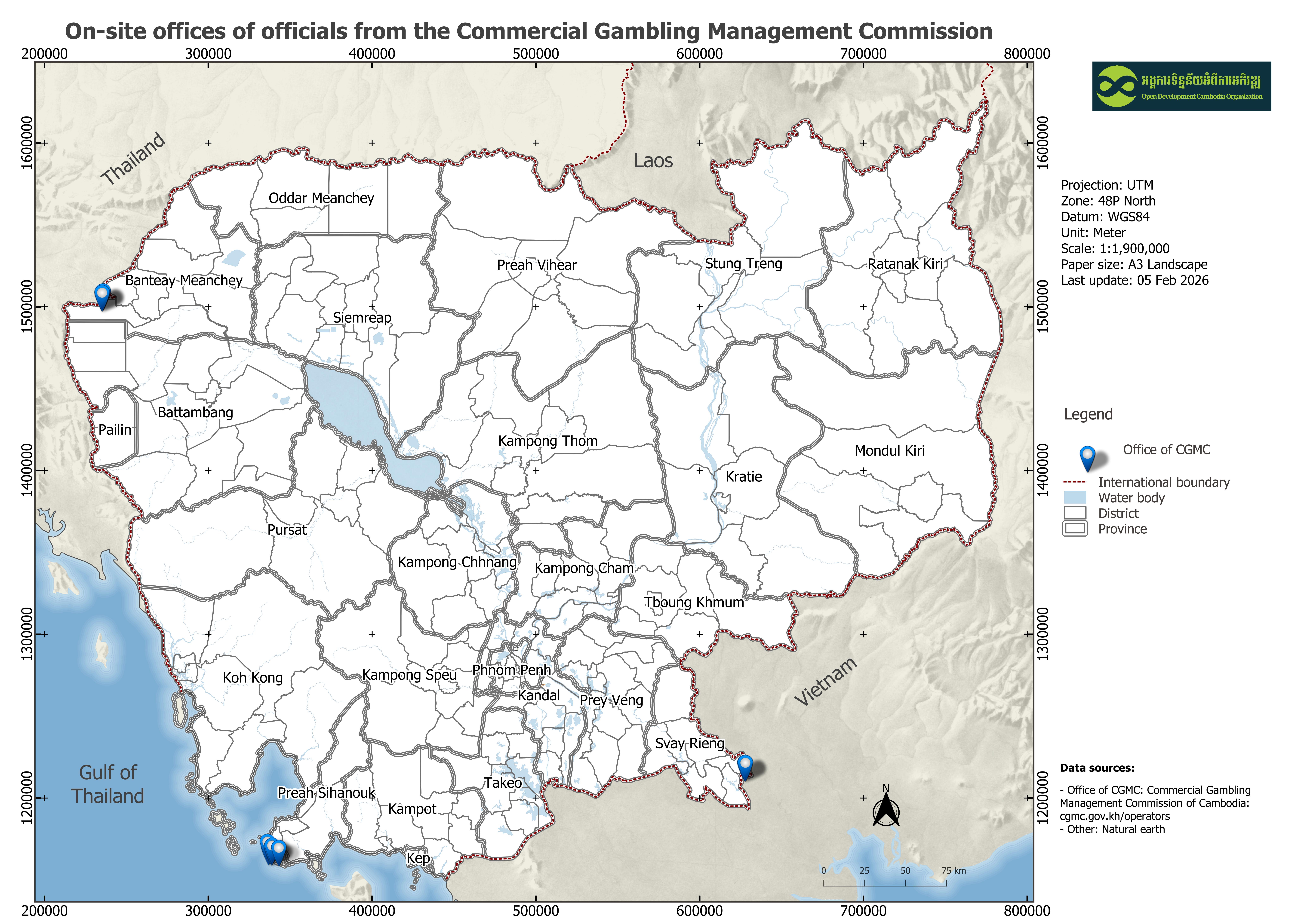 ទិន្នន័យនេះមានព័ត៌មានភូមិសាស្ត្រអំពីទីតាំងការិយាល័យ CGMC (គណៈកម្មាធិការគ្រប់គ្រងល្បែងពាណិជ្ជកម្ម) ដែលស្ថិតនៅក្នុងទីតាំងកាស៊ីណូទូទាំងប្រទេសកម្ពុជា។ រួមមានការបែងចែកទីតាំងការិយាល័យតាមតំបន់ (ដូចជា SEA, KHT, KHV), ឈ្មោះកាស៊ីណូ, អាសយដ្ឋាន, ព័ត៌មានកូអរដោនេភូមិសាស្ត្រ (រយៈទទឹង និងរយៈបណ្តោយភូមិសាស្ត្រ) និងប្រភពយោង។